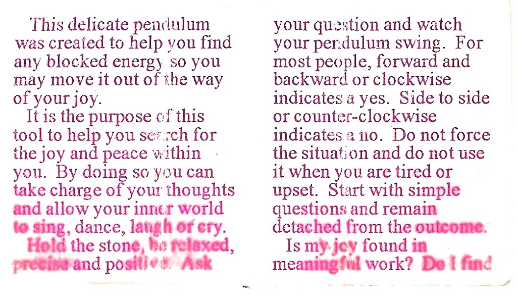 The tiny folder insert inside of 1.5" X 2" inch purple velvet bag for Joy's crystal pendulum.